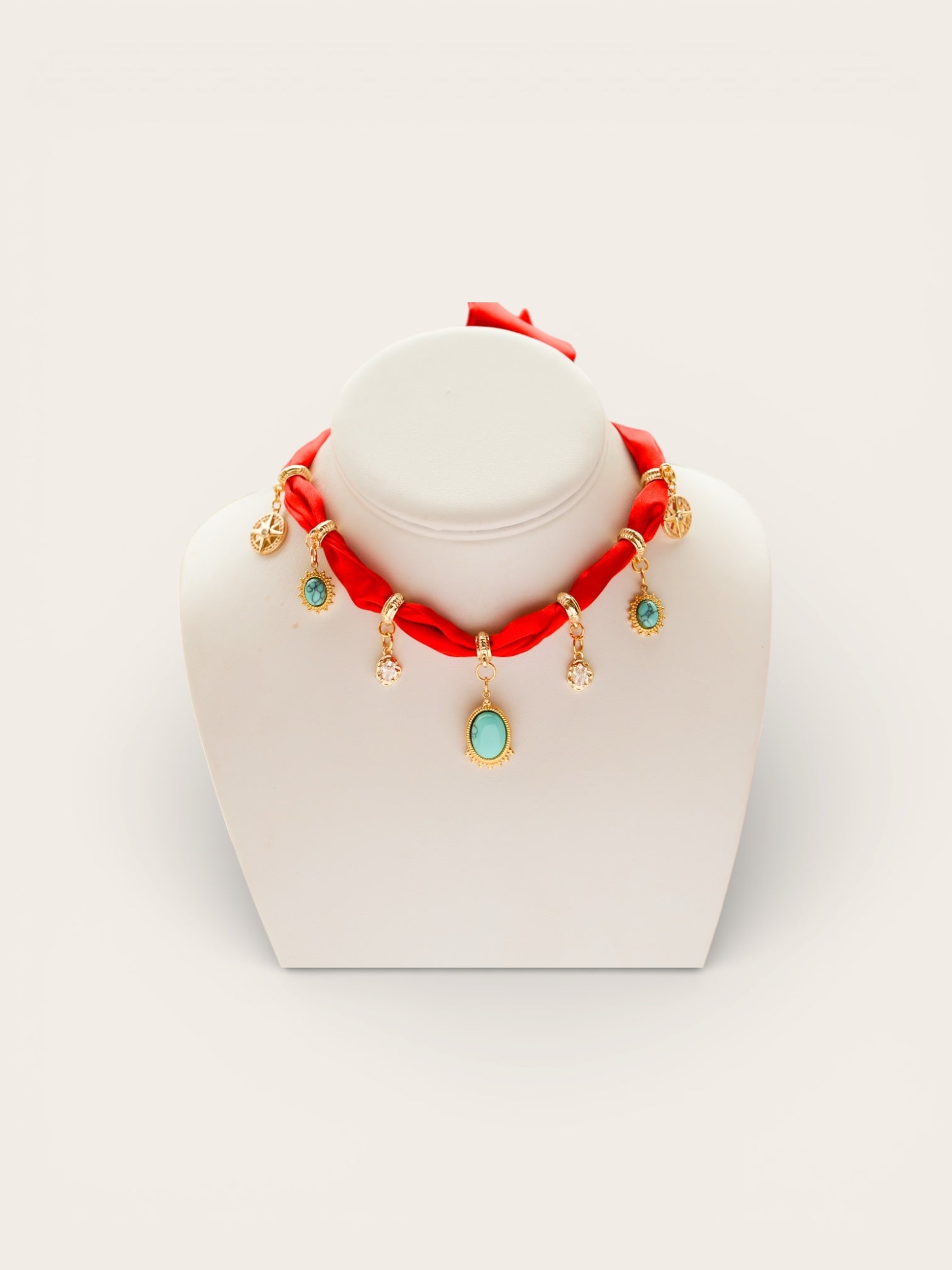 The Santa Fe Silk Necklace features a vibrant red silk base with turquoise-inspired accents and luminous crystal drops. Designed to elevate even the simplest outfit.